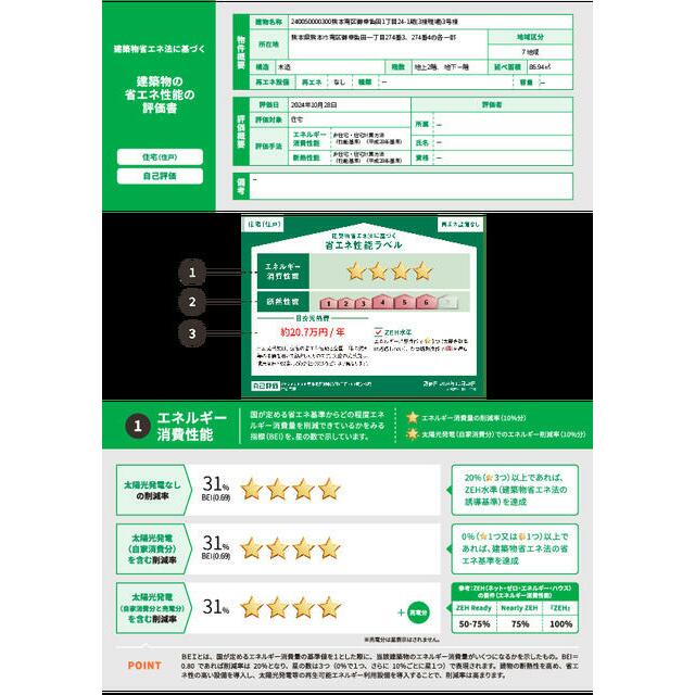 | エネルギー消費性能 | ★★★★(削減率30%達成) | 断熱性能 | 6段階/7段階中 |